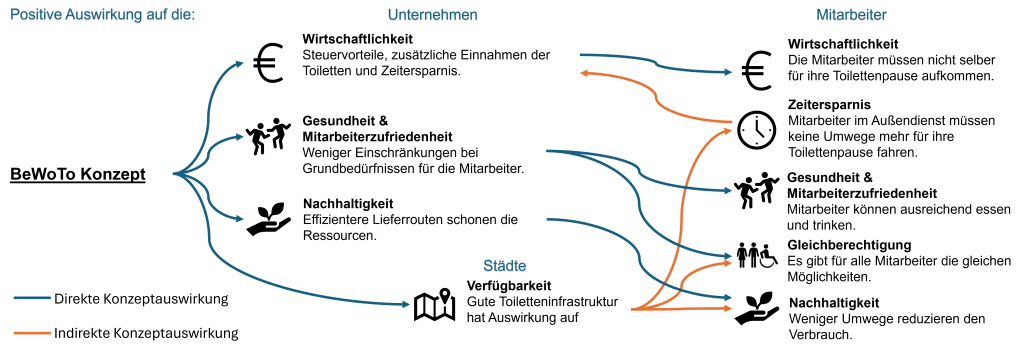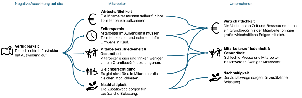 Durch die Abhängigkeiten der Unternehmen von den Mitarbeitern und der Infrastruktur entsteht durch die schlecht ausgebaute Toiletteninfrastruktur eine Problemkette, die für wirtschaftliche und gesundheitliche Verluste, sowohl bei den Unternehmen als auch bei den Mitarbeitern, verantwortlich ist.