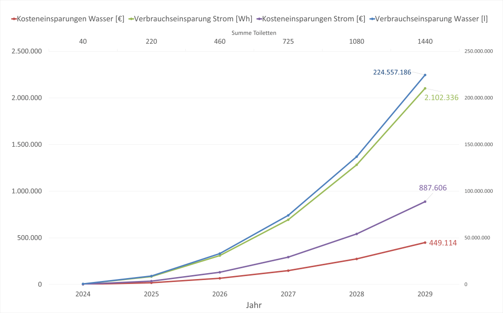 - Kreislaufwirtschaft: Einsatz von 92 % recycelbaren Materialien in den Toilettensystemen.