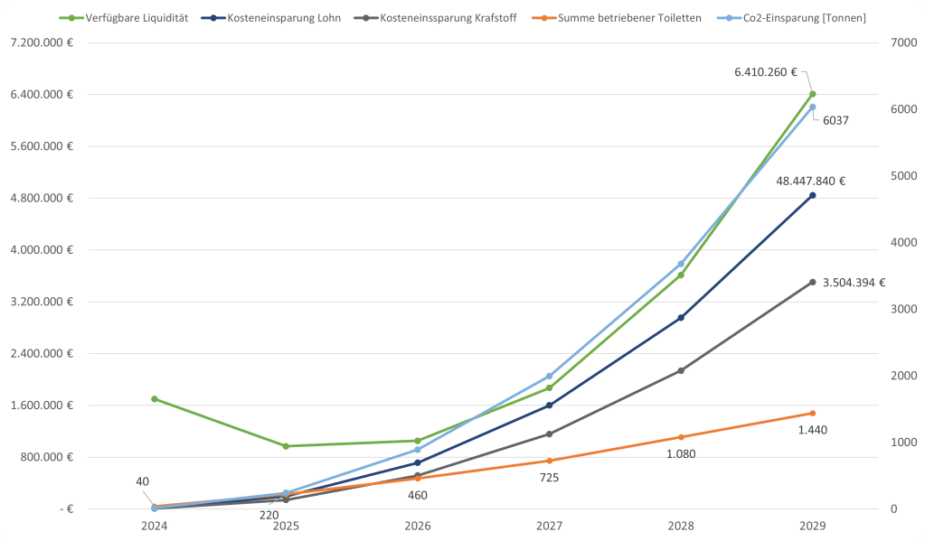 Lohnkosten: Optimierte Abläufe und Standorte senken die durchschnittlichen Lohnkosten um 3,00 € pro Nutzung. Dies summiert sich für die gesamte Branche bis 2029 auf Einsparungen von über 48 Millionen Euro.